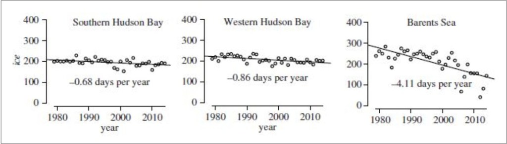“Unexpectedly, body condition of female polar bears from the Barents Sea has increased after 2005, although sea ice has retreated by ∼50% since the late 1990s in the area, and the length of the ice-free season has increased by over 20 weeks between 1979 and 2013. These changes are also accompanied by winter sea ice retreat that is especially pronounced in the Barents Sea compared to other Arctic areas” [Lippold et al. 2019:988]