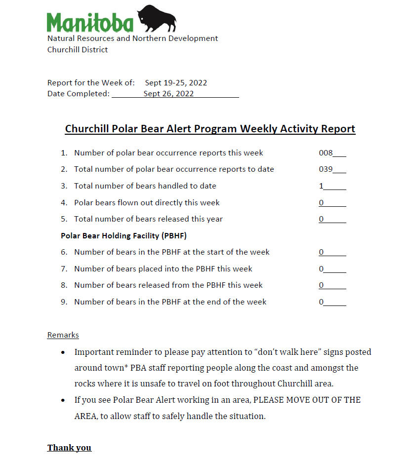 While many of these weekly reports are missing since the first was issued the last week of July, the latest Churchill problem bear report, for week 9 ashore (19-25 September, second-last week of the month) is pretty boring, with only 1 bear needing to be physically handled in all that time: