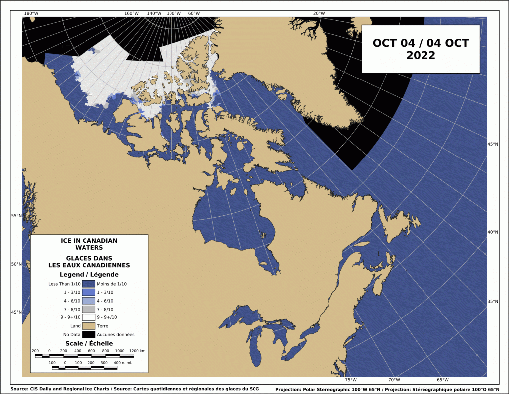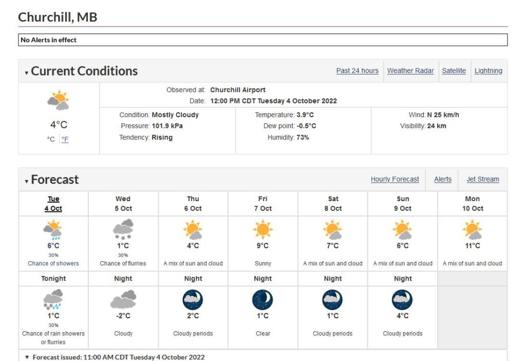 Freeze-up on Hudson Bay looks to be a ways off as the ice chart above shows, although forecasted temperatures overnight near Churchill are near freezing.