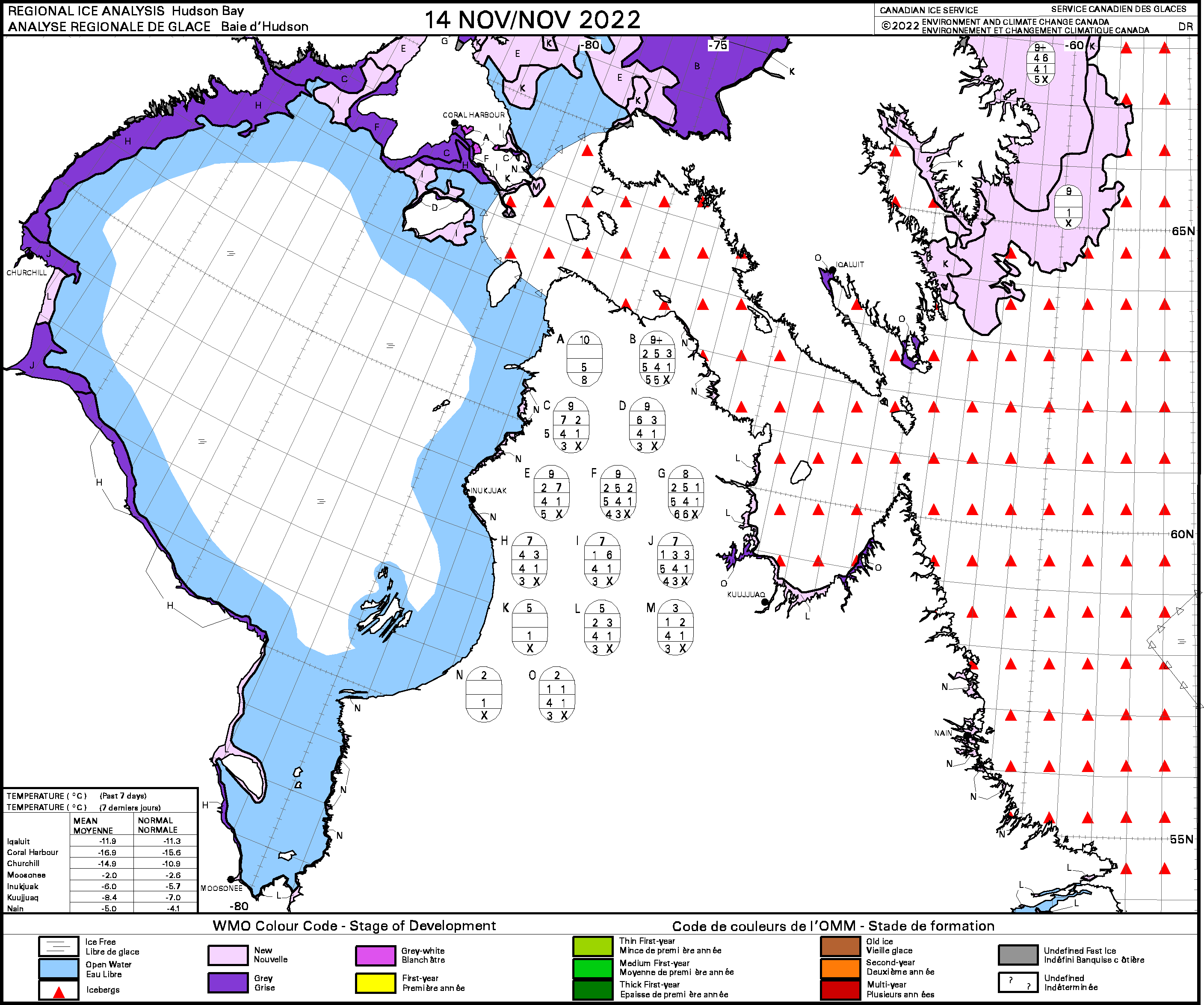 In other words, freeze-up of sea ice on Hudson Bay is not getting progressively later and later as the models predict. The ice chart below for the 2nd week of November (14th) shows a ‘normal’ (like the 1980s) ice formation pattern: a late freeze-up would be the first or second week in December: