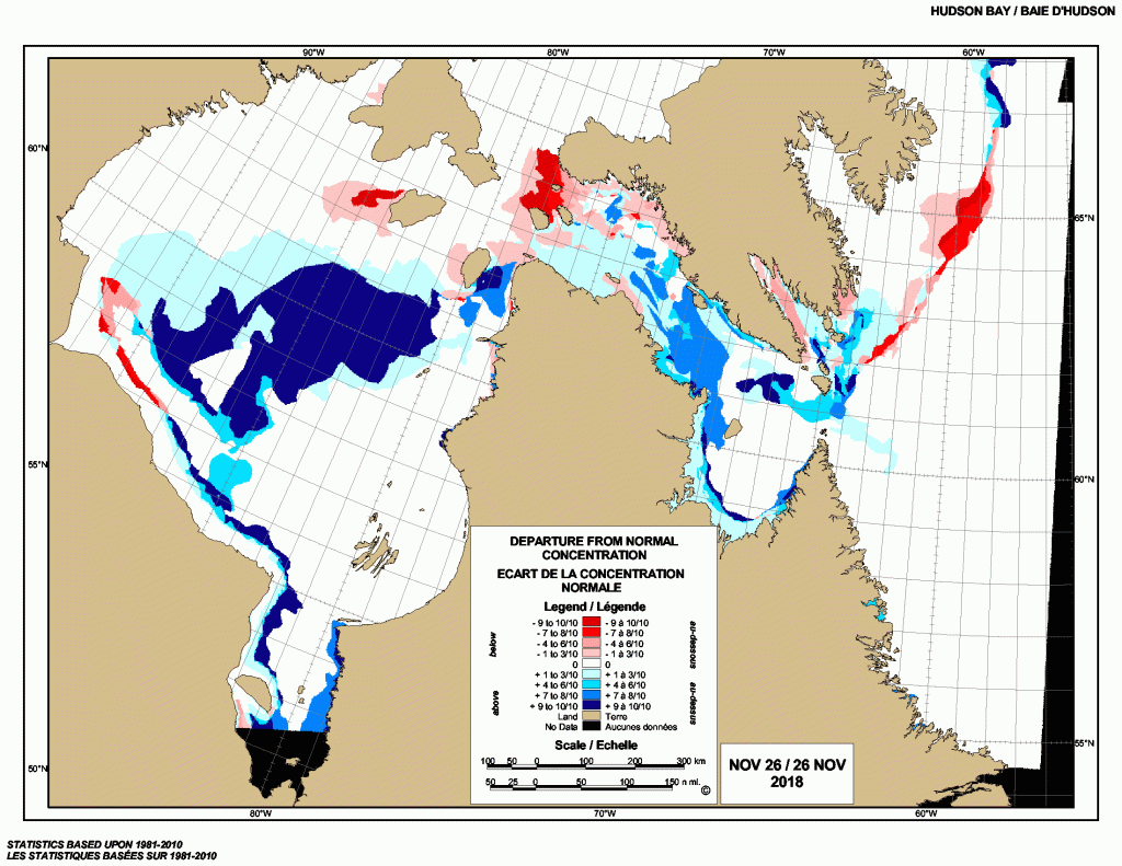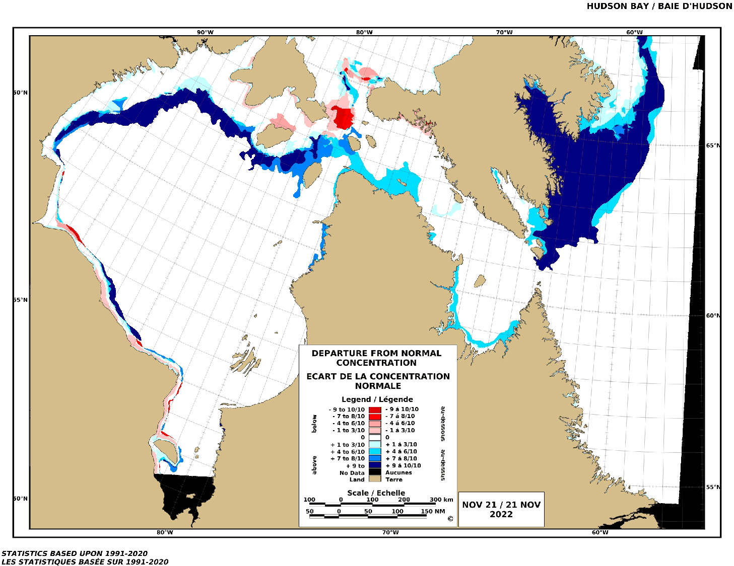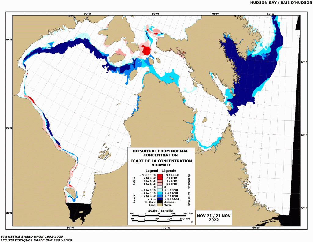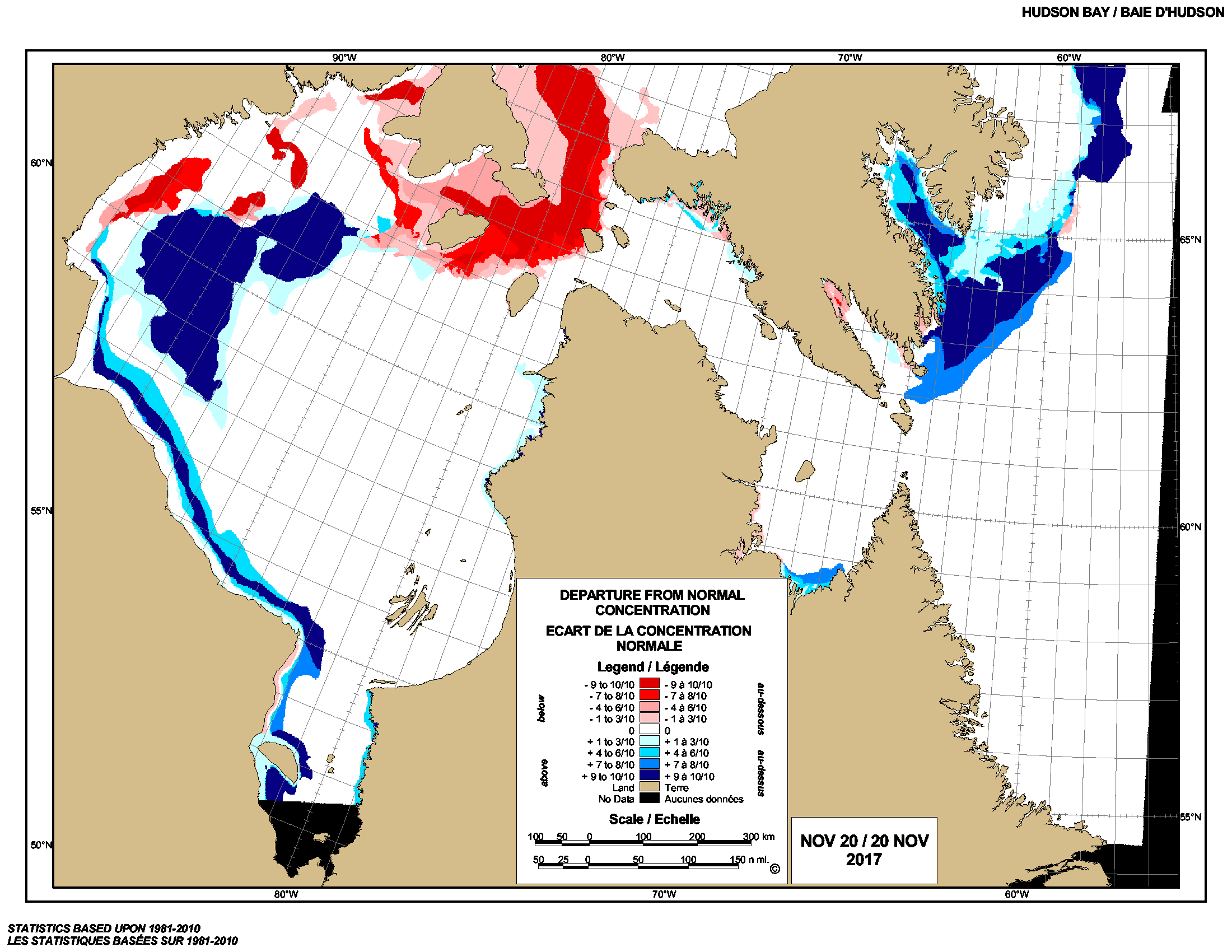 I couldn’t find any archived ‘departure from normal’ charts I’d archived that had this much dark blue in Davis Strait at this date. The closest I could find was 2017, which was also a really early freeze-up in Hudson Bay: