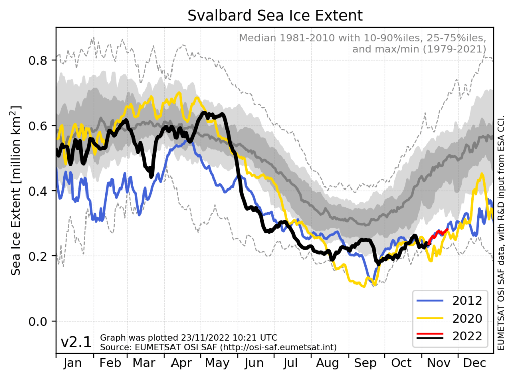 Two weeks ago (10 November 2022), sea ice had reached the north coast of Novaya Zemlya: