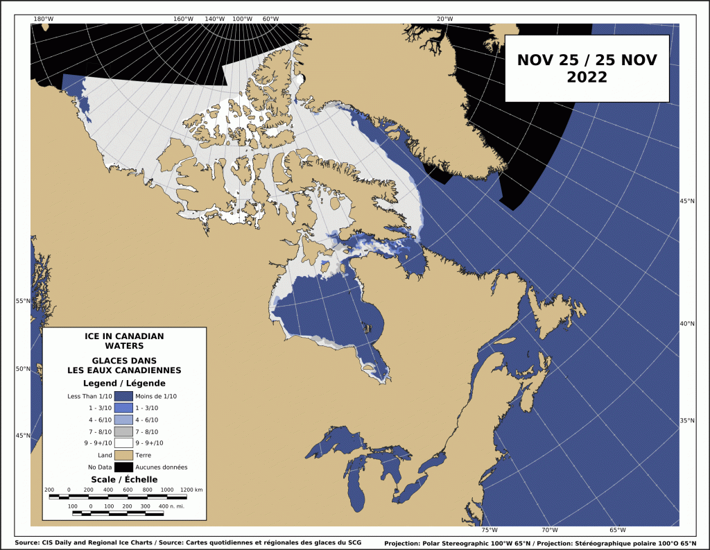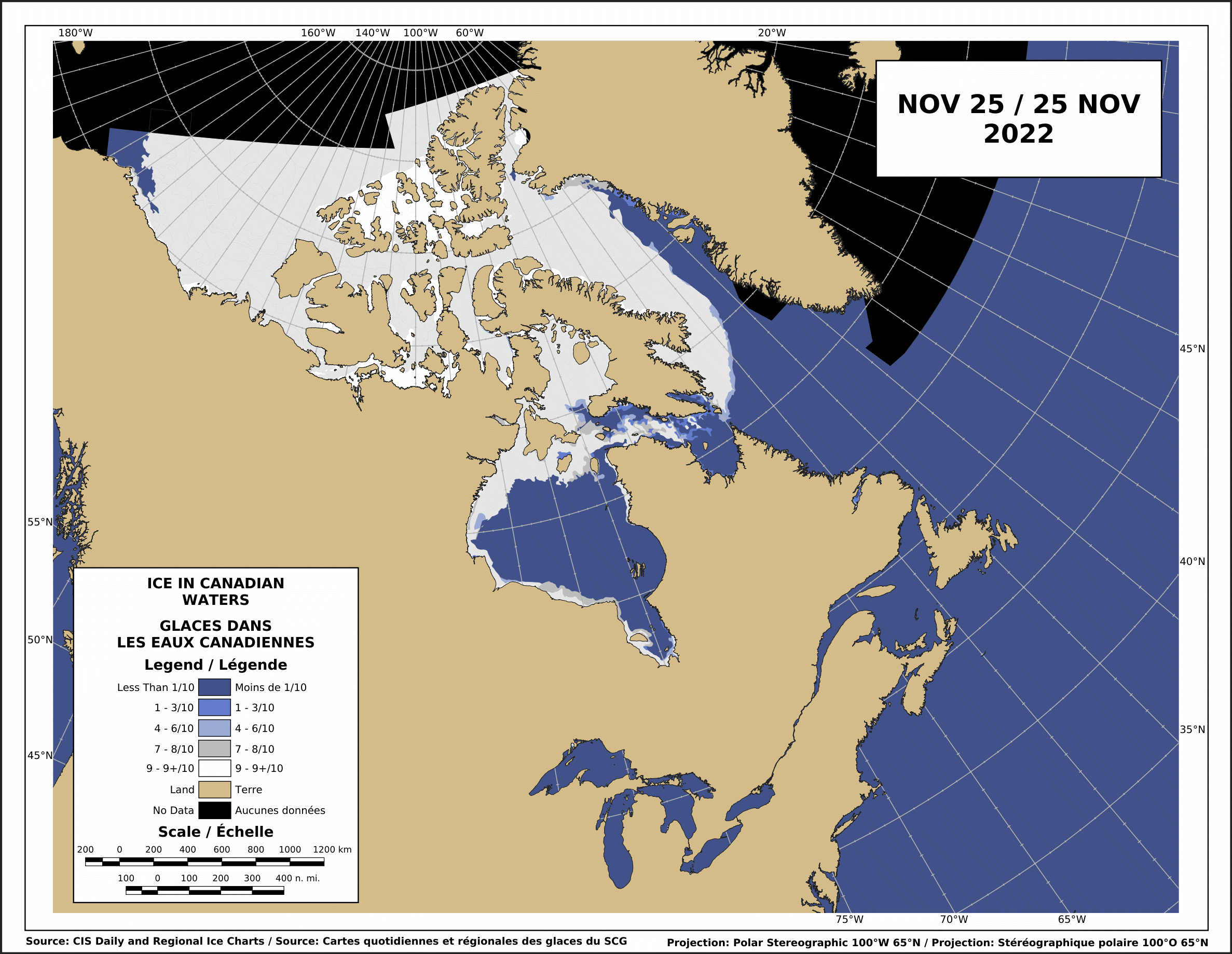 Sea ice according to the Canadian Ice Service for 25 November (the same day as Derocher’s map), since the ice on his image is very difficult to see and which CIS says is ‘more than usual’ for this time of year: