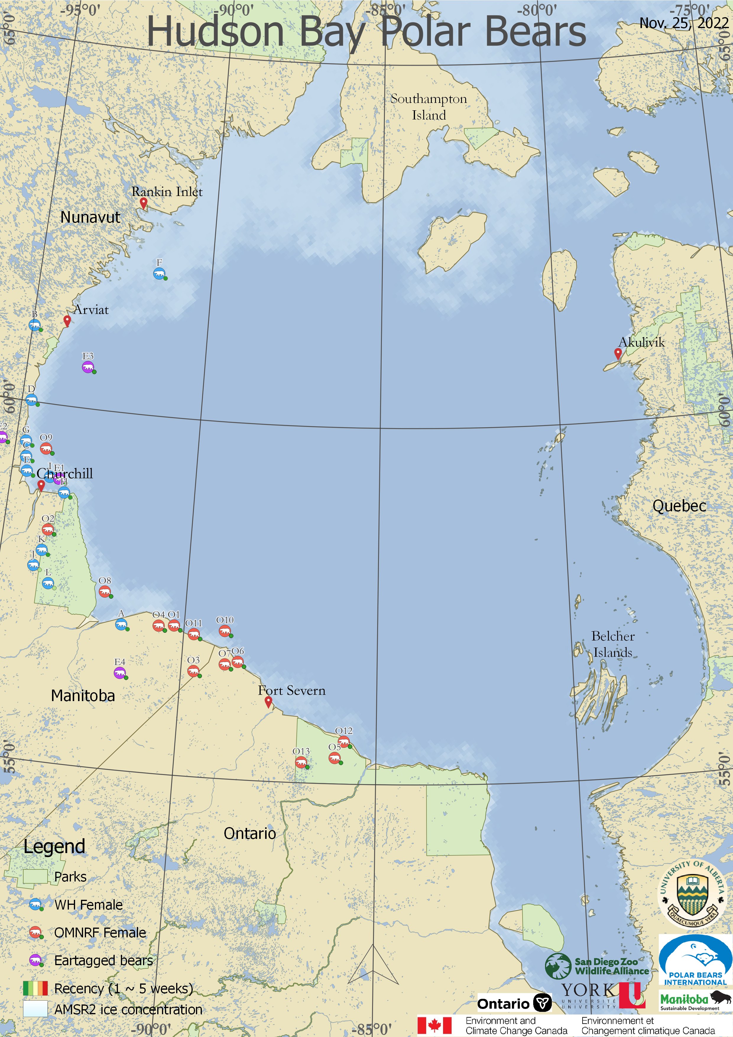 Freeze-up in Hudson Bay is slowing picking up & the polar bears we’re tracking are moving offshore. It’s a late freeze-up this year but hopefully the ice will form quickly now. Temperatures are forecast to drop this week & the bears can get serious about hunting seals again.