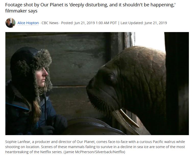 In a CBC News article (21 June 2019) about “how documentaries seek to bring climate change stories to life,” Our Planet director Keith Scholey revealed that the special preview version of the eight-hour series Our Planet (which we know from other sources included the falling walrus scenes) was meant to influence WEF audiences three months ahead of the film’s official premiere: