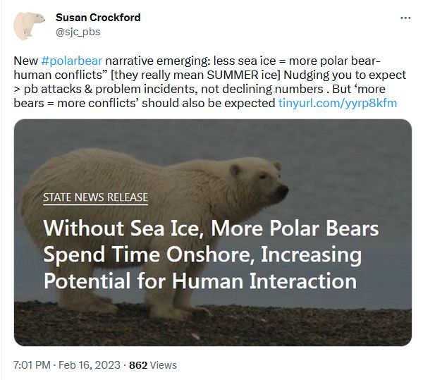 “Poor ice conditions for polar bears at Svalbard this year. Low ice will make tough hunting conditions this coming spring. Time to plan for more human-bear conflicts unless conditions change.” [13 Feb 2023 tweet, my bold]