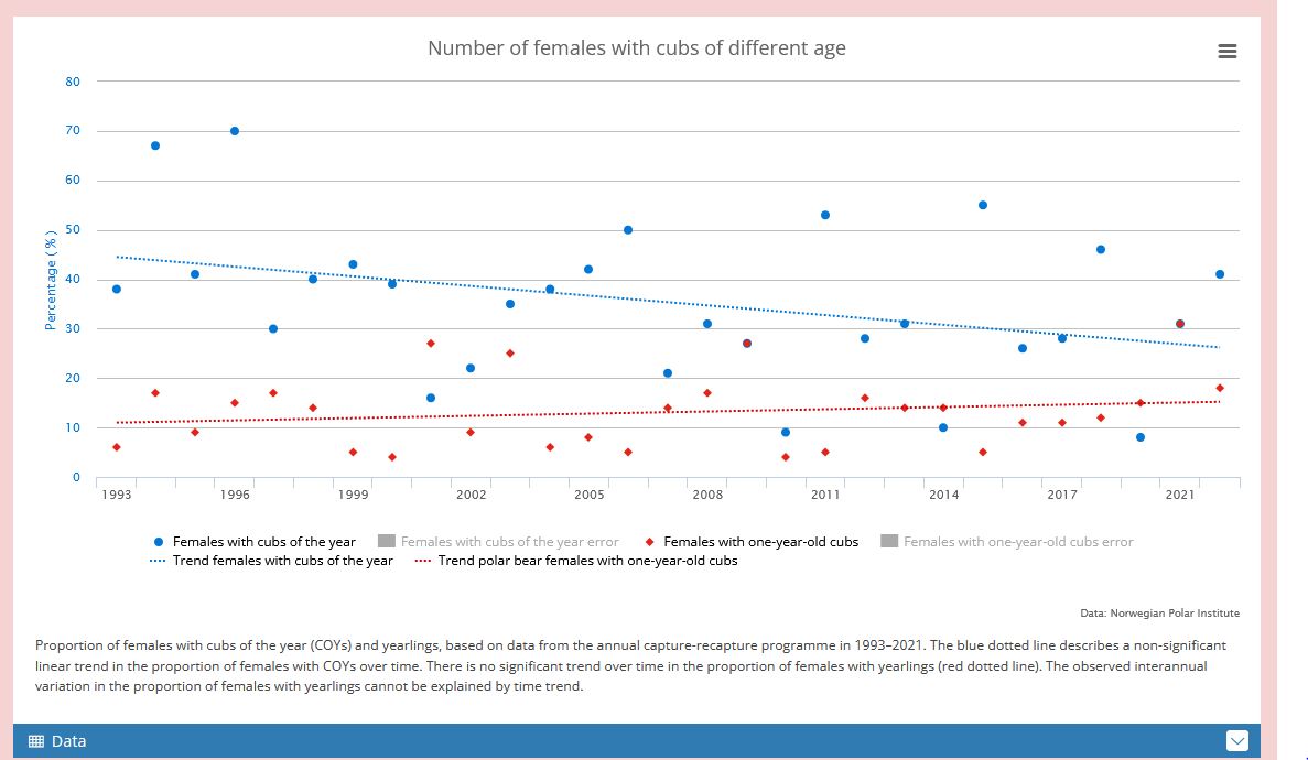 Spring research in Svalbard, Norway in 2022 showed body condition of male polar bears was stable and the number of females with cubs (both cubs-of-the-year and one-year old cubs) were up compared to many previous years. While many bears have abandoned the Svalbard region for less volatile ice conditions in the eastern Barents Sea around Franz Josef Land, the 300 or so that remain are still doing well (Aars 2015, 2018, 2022; Aars et al. 2017; Anderson et al. 2012; Haavik 2022), despite having lost 5-6 times as much summer ice as Western Hudson Bay (Lippold et al. 2019:988; Regehr et al. 2016).