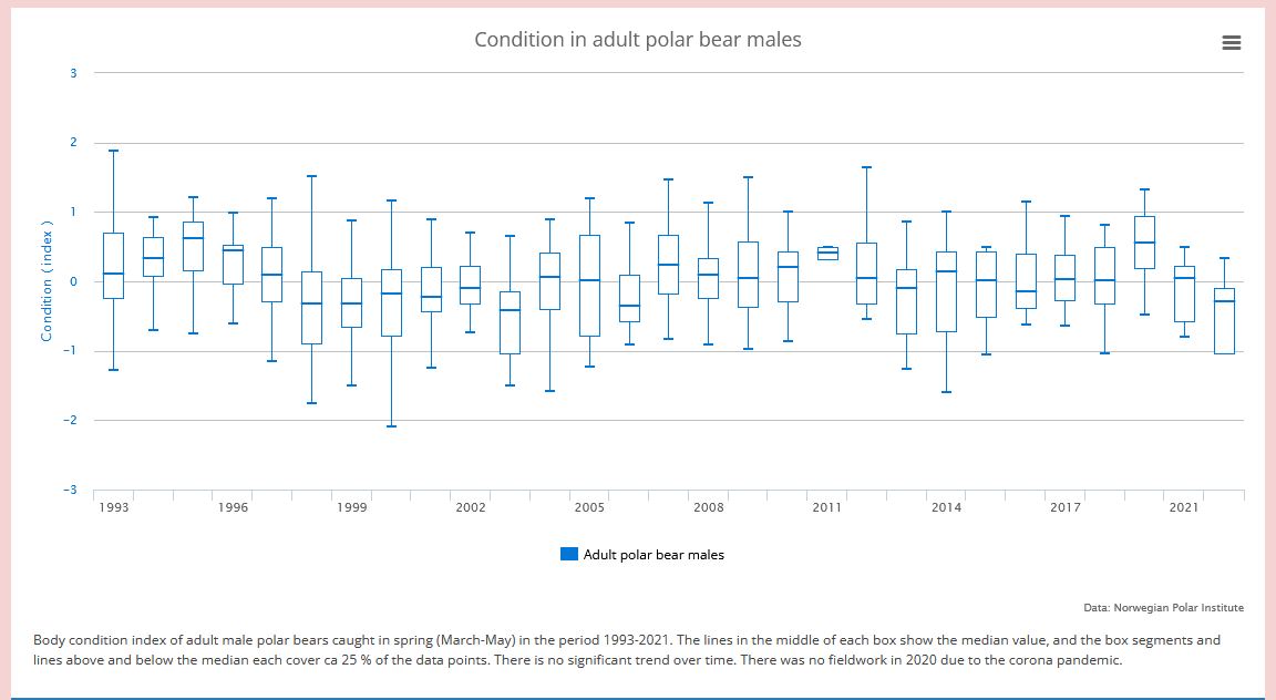 “Unexpectedly, body condition of female polar bears from the Barents Sea has increased after 2005, although sea ice has retreated by ∼50% since the late 1990s in the area, and the length of the ice-free season has increased by over 20 weeks between 1979 and 2013. These changes are also accompanied by winter sea ice retreat that is especially pronounced in the Barents Sea compared to other Arctic areas” [Lippold et al. 2019:988, my bold]