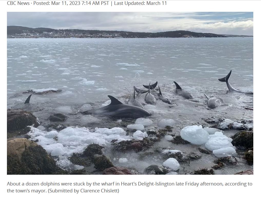 UPDATE 20 March 2023: Another pod of white-beaked dolphins has perished from the ice over the weekend. More than 30 dolphins were trapped near the town of Carbonear, which is on Conception Bay (the next big bay southeast from Trinity Bay), according to CBC News. Given the ice conditions, this is almost certainly a different pod to the one reported on two weeks ago.