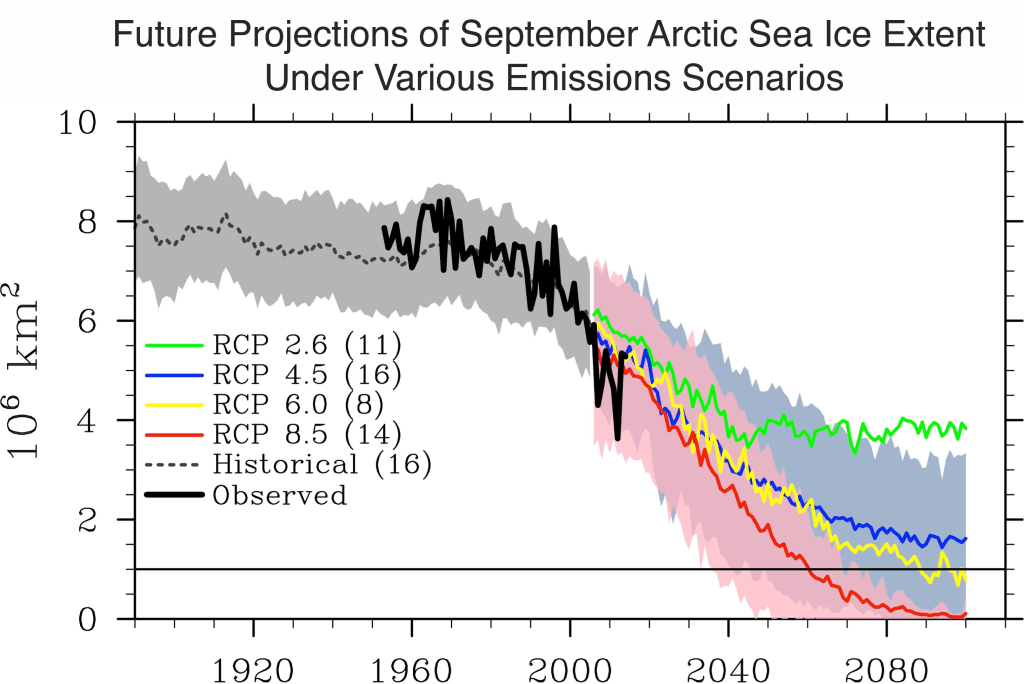 Updated sea ice predictions published in 2014 by the Stroeve team (see below) went to the other extreme, using totally implausible RCP 8.5 scenarios to predict a virtually ice-free Arctic (< 1 mkm2 ice extent) before 2040, which seem just as likely to be just as wrong as their 2007 attempt (Hausfather and Peters 2020; Pielke and Ritchie 2021; Stroeve et al. 2007, 2014; Swart et al. 2015).