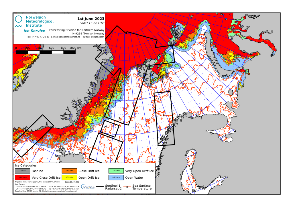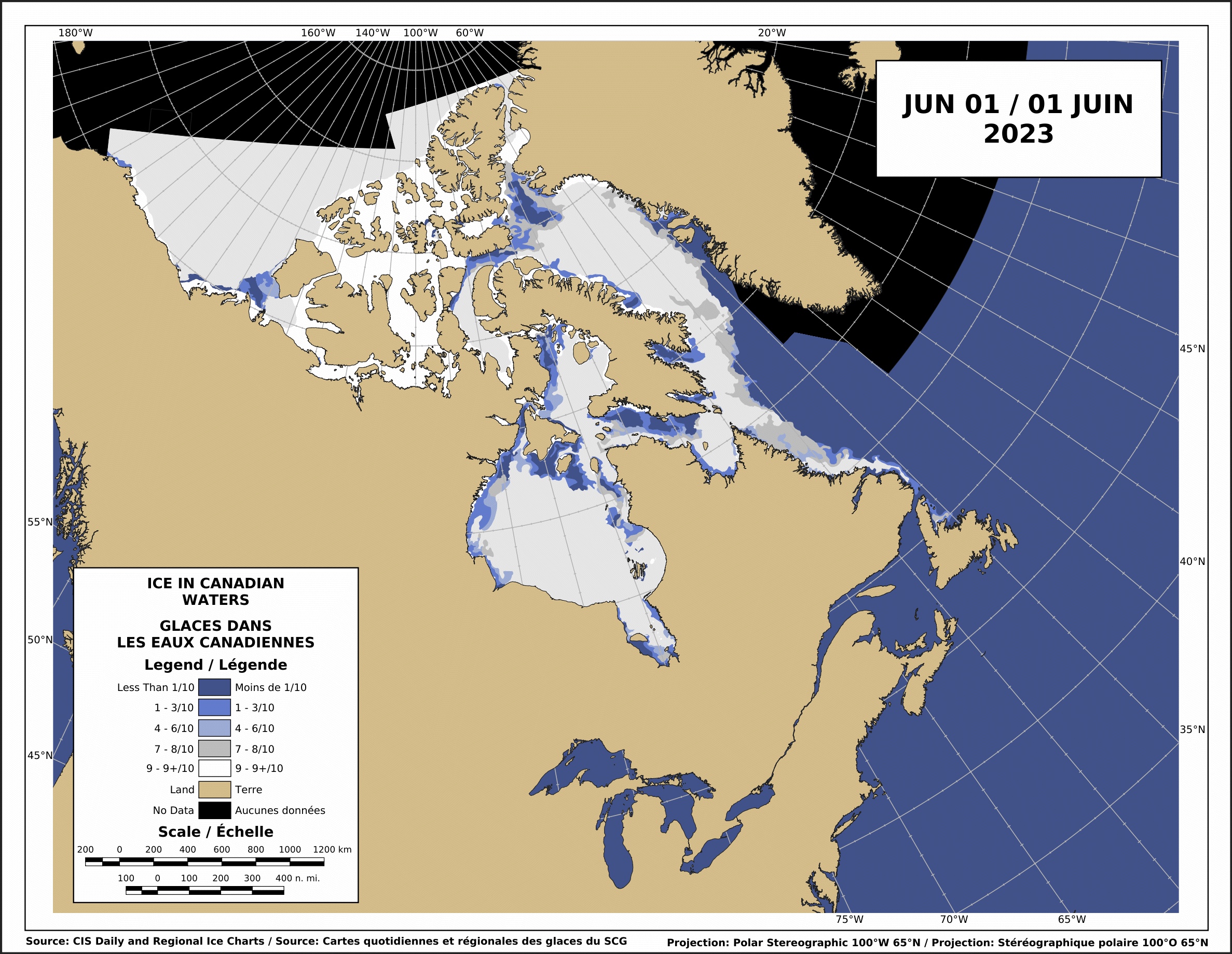 Open water leads and polynyas in the sea ice, which are clearly visible in the ice chart below, are now important areas for polar bears to attempt to hunt, because these highly productive areas attract seals (Stirling et al. 1981).