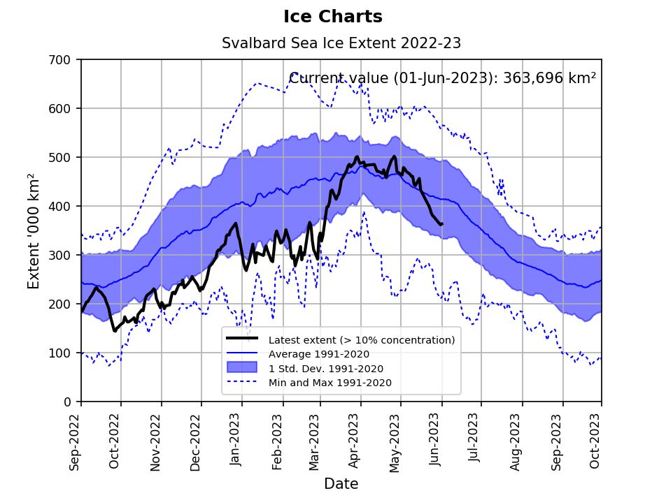 Ice extent around Svalbard is declining, as it does every year about this time: