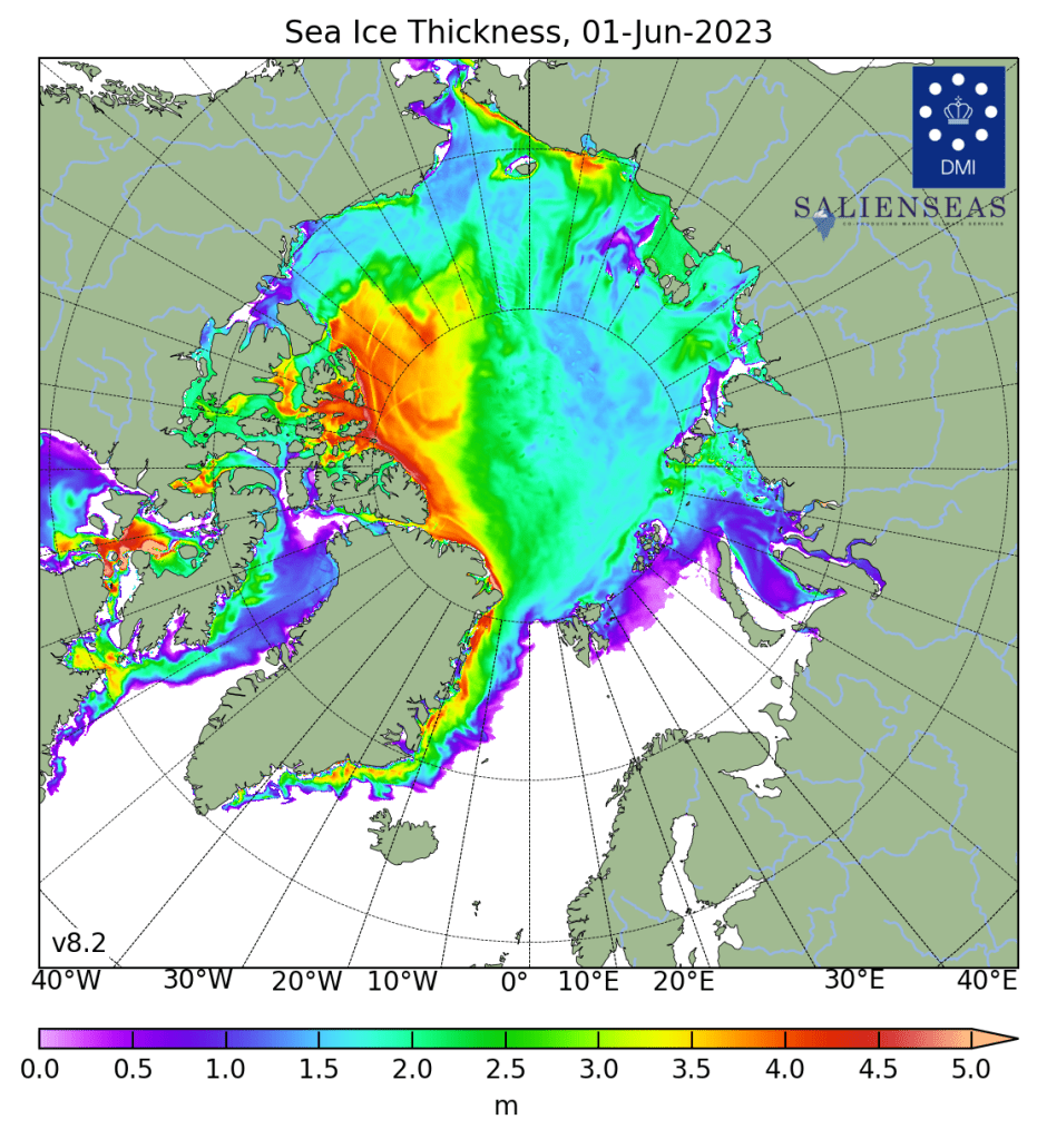 Where red bits are 5m thick and even the green/yellow is 2.5-3.5m. This thick ice is not likely to melt over the summer but it can get broken up and flushed out of the Arctic by winds and currents, where it will melt in warmer waters.