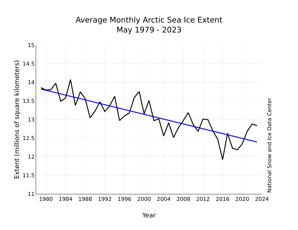 The graph below shows that sea ice extent for May 2023, according to NSIDC compared to previous years, is only slightly less than it was in 1989 and 1995: