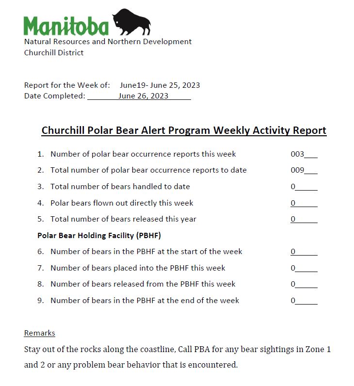 The first real Churchill Polar Bear Alert Report came out (for week 2 of the summer season, 19-25 June), with only a few bears onshore close to town requiring encouragement to hang out further afield.