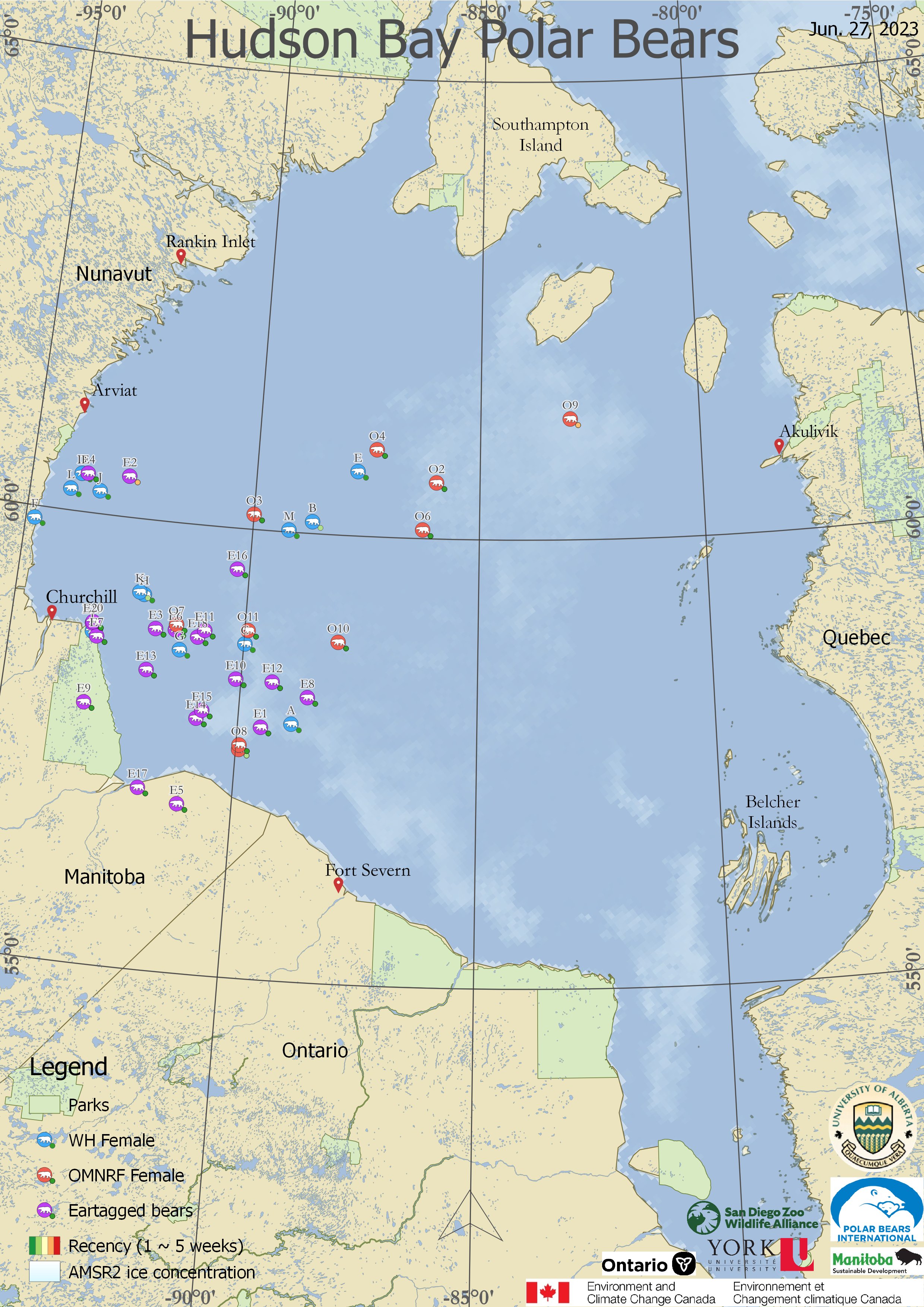 Thus, according to Cherry’s criteria, this year we should expect most bears to be onshore in WH by 15 July. However, as of 27 June, only 6 of Andrew Derocher’s tagged bears were onshore and the rest (27 of them) were still out on low concentration sea ice (see map below). Several of them are way out in the middle of the bay. Time will tell whether they will all head to shore over the next two weeks or if some will linger a few weeks longer on bits of remnant ice, as seems to be the usual pattern in recent years.