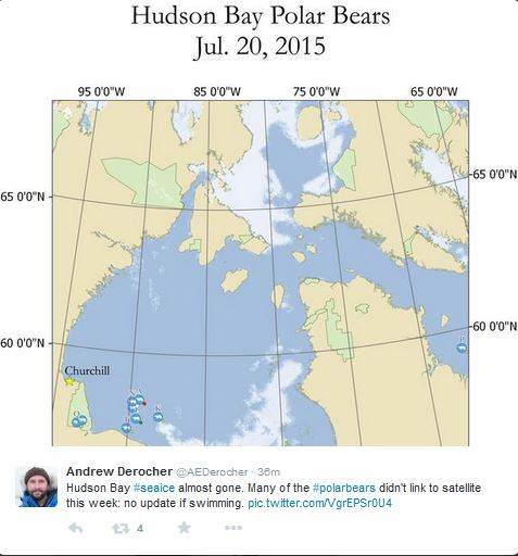 At 20 July 2015, more than half of collared Southern Hudson Bay bears were reported still far out on the ice. On the same date (see tweet below), polar bear specialist Andrew Derocher noted that only 2 out of 9 collared bears had come ashore (one way over in Hudson Strait), when the prediction based on 30% WH ice coverage should have seen them all onshore by 30 June (Cherry et al. 2013):