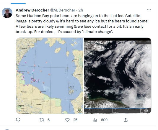 In the weekly ice anomaly chart below, red is less than average but blue is more than average. If the red areas in central and western Hudson Bay are forcing polar bears ashore early because of “climate change” (as per Derocher tweet, above), what’s causing southern Hudson Bay, Hudson Strait, Labrador Sea and Davis Strait to have more than average ice coverage? Do Western Hudson Bay polar bears really suffer harm due to global climate change at the very same time that Southern Hudson Bay and southern Davis Strait bears thrive in better-than-the-1980s conditions, even though some of them live further south? That sounds more like a big game of climate change picking-of-cherries than a scientific assessment of fact.