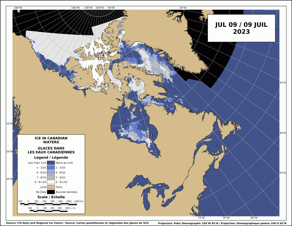 He also says it’s “hard to see any ice” on the satellite image he provides but if you look at more informative charts, it’s apparent there is actually a fair amount of ice present. Even two days later, at 9 July, there was enough ice to support any bear that wanted to stay offshore for a while longer.