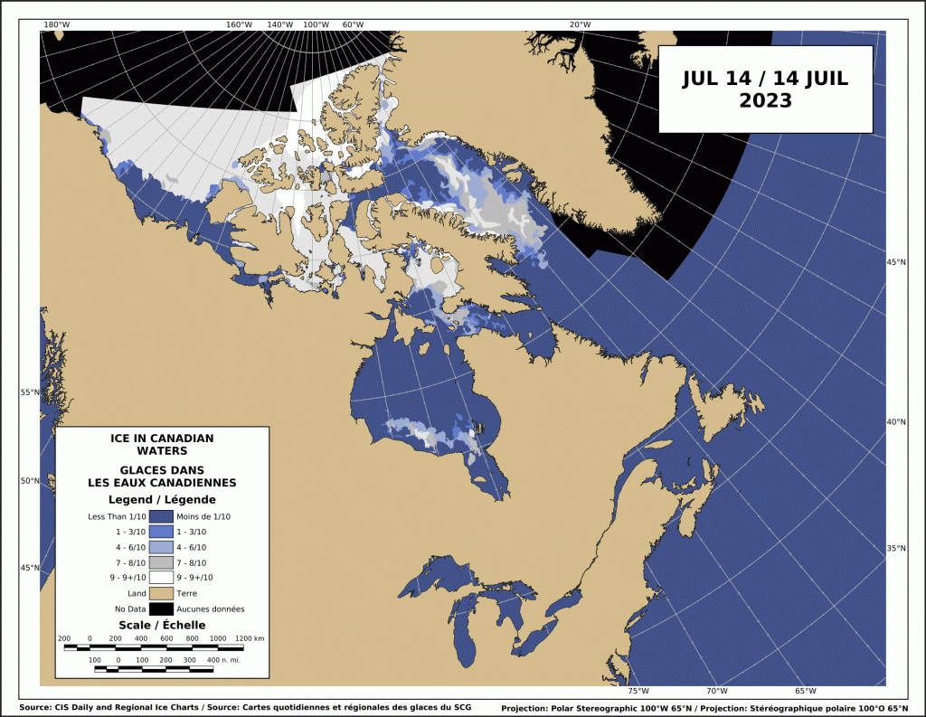 For the week of 10 July 2023, this ice chart from the Canadian Ice Service (below) suggests that at least four tagged bears (see chart above) are resting on ice that the satellites can’t see. It’s unlikely they are swimming because they were in similar locations last week. This is an earlier-than-usual breakup pattern, similar to what was documented for the two decades after the step-change in 1995.