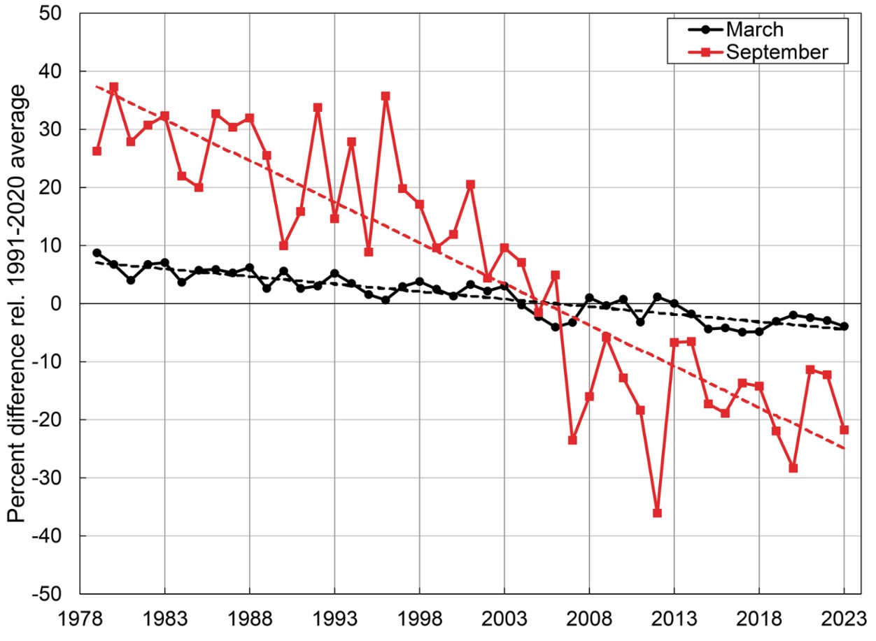 From this month’s NOAA Arctic Report Card for 2023 on sea ice: