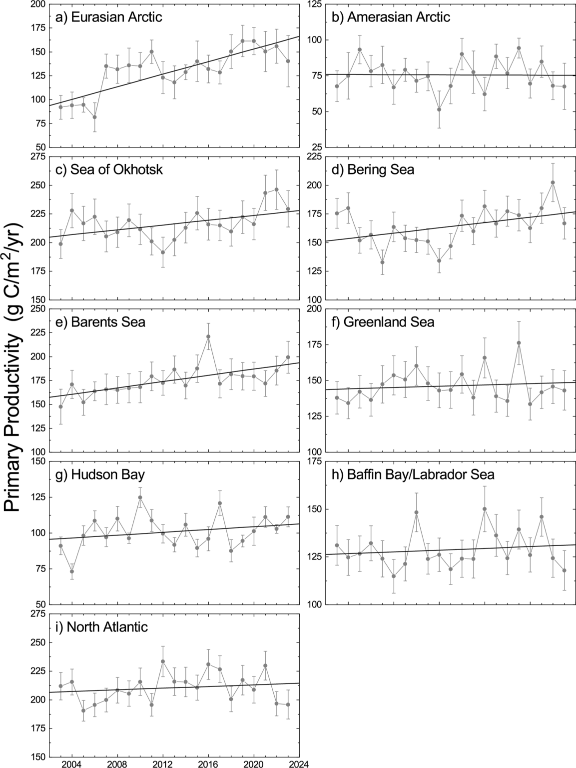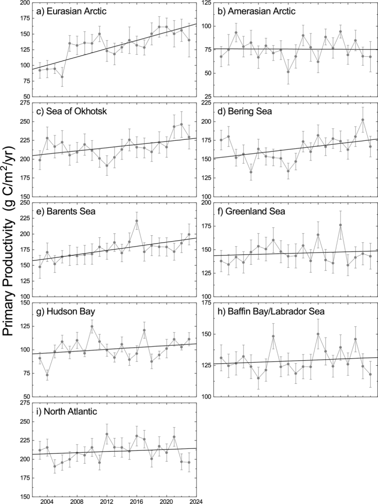 Also according to NOAA researchers, primary productivity in 2023 continued to be higher than 2003 across the Arctic, with increased values especially in the Barents Sea and Hudson Bay which ultimately benefits polar bears with more seals to eat: