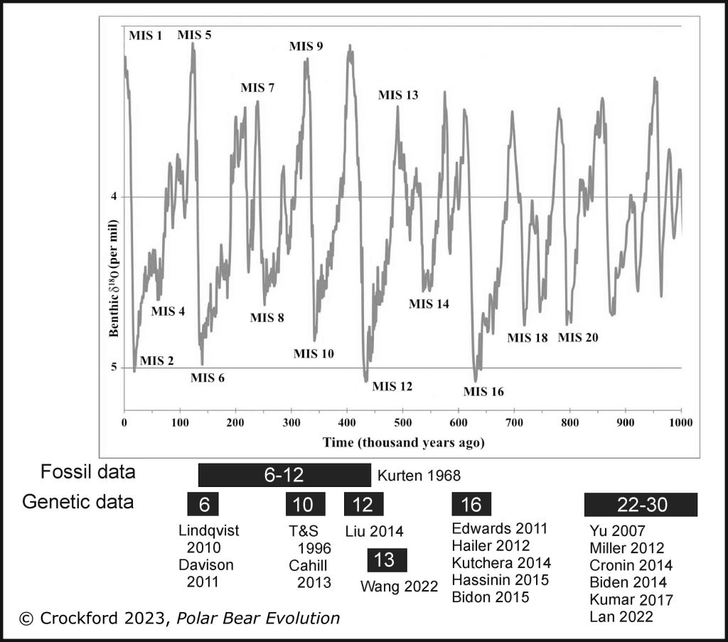 The evidence suggests the most plausible time for the rise of the polar bear as a new species was about 140kya at the height of the severe MIS 6 glacial period (see below, from Crockford 2023a).