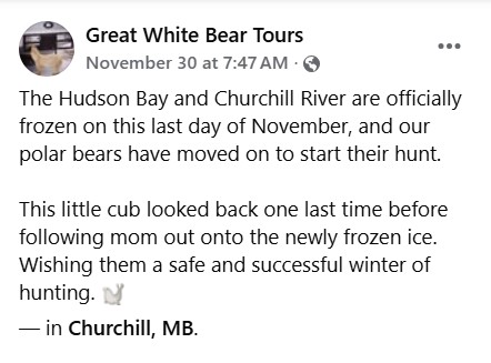 Literally the only mention I found of how Western Hudson Bay polar bears are doing relative to sea ice formation this fall came from a Facebook post by a tour company on 30 November 2025: