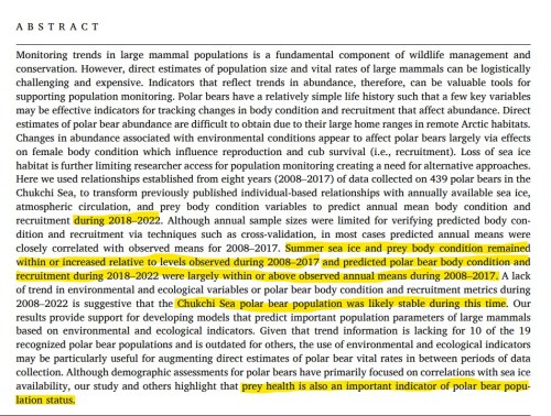 Over in the Chukchi Sea, a similar admission that bears are doing well despite summer sea ice declines came in the form of a paper published in 2024 by Karyn Rode and colleagues [my highlights], pdf here, “Identifying indicators of polar bear population status”: