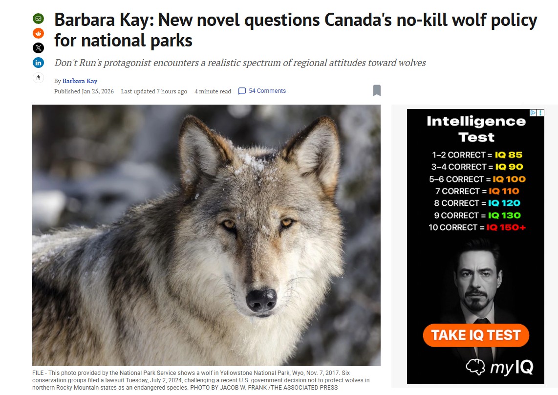 Barbara Kay column on wolf control and my novel 24 Jan 2026 screencap
