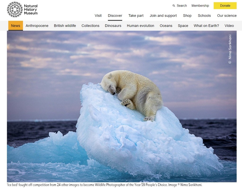 So it’s not at all surprising that yet another amateur climate activist has resorted to using the emotional ploy of a photo of a polar bear on sea ice to win the 2023 Wildlife Photo of the Year People’s Choice Award sponsored by the Natural History Museum London (UK).