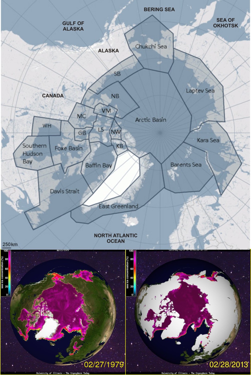 Figure 1. Polar bear distribution map (adapted from the one provided by the PBSG) compared to sea ice concentration at Feb 28 (at or near the seasonal maximum extent) 1979 and 2013. I can’t see a difference – can you see a difference? The only place there is consistently sea ice in winter but not polar bears is the Sea of Okhotsk, but there is no evidence that polar bears have ever lived there despite the presence of seals. Click to enlarge