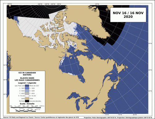 The chart above is from NSIDC Masie for 15 November 2020 (Day 320) – it showed the same large offshore patch of ice the day before. However, only today did the Canadian Ice Service (CIS) chart show even part of the offshore patch (below):