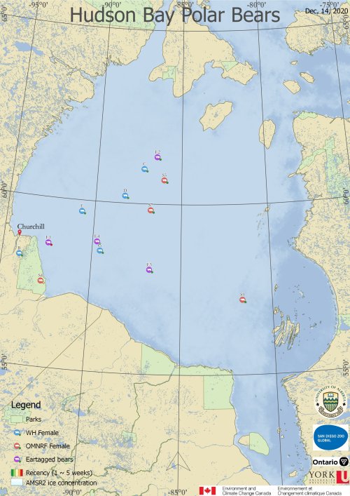 Western Hudson Bay polar bears with collars or tags deployed by Andrew Derocher and his University of Alberta crew (below) are spread out over the ice of the bay (two on land are denning females), a number are on the thickest ice in the north but others are on thinner ice to the south and east: