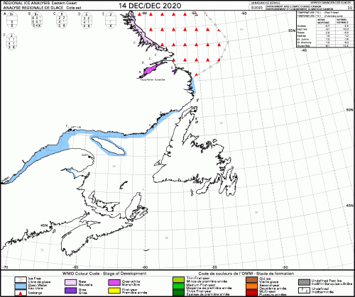 Pack ice has moved down from the north through Baffin Bay into Davis Strait (below) and will soon be off the coast of Labrador, which has somewhat less ice than usual this year at mid-December: