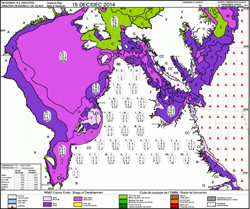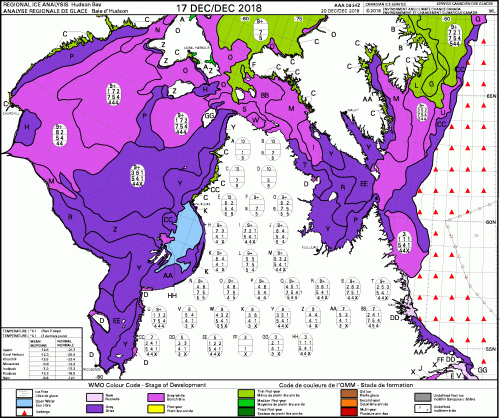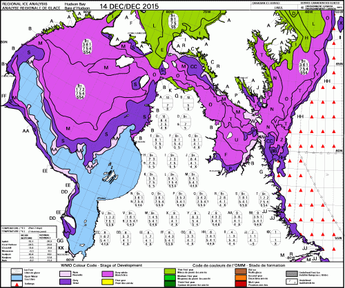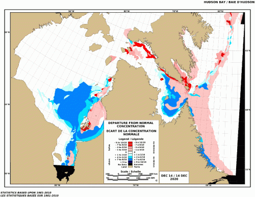 This year at mid-December, there was more ice than usual in central and southern Hudson Bay (below) and somewhat less than usual in the eastern portion.