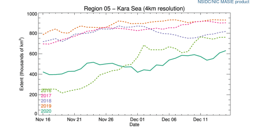 Ice cover in the Kara Sea at 15 December (below) is lower compared to the last five years but it’s unclear how much effect this will have on local polar bears.