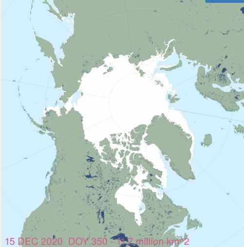 Ice covereage in the Canadian Eastern Arctic at mid-December is about average this year, according to CIS charts – only a bit of red and pink indicating ‘below normal’ in the east (off of Greenland):