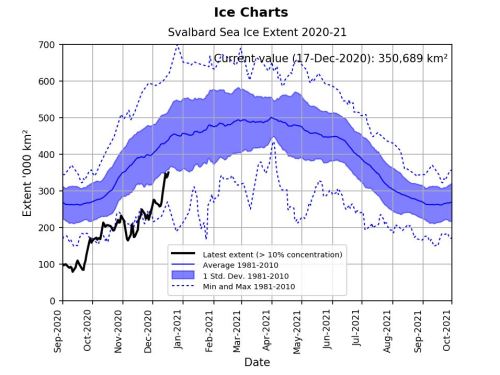Freeze-up in the Greenland Sea is progressing a bit faster than usual for the last five years (below), but not remarkably so: