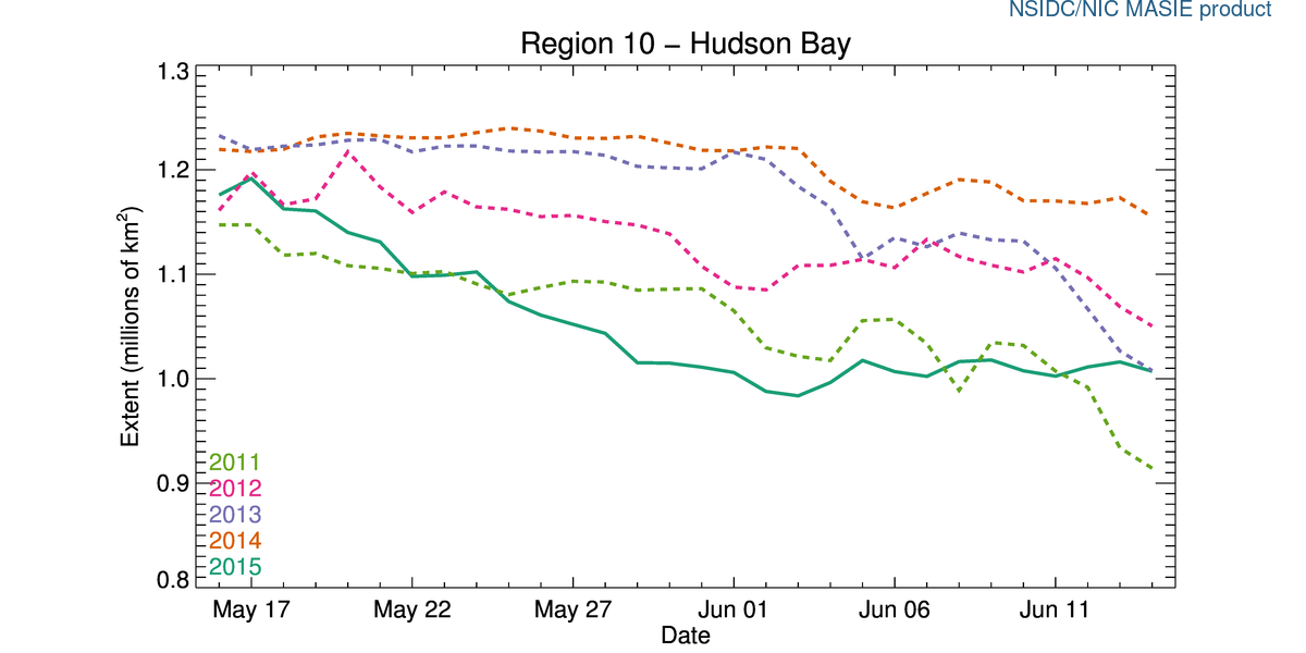 Update 17 June 2015: Sea ice images for the week 18 June 2015 compared to other years added below, for Hudson Bay and the Beaufort Sea.