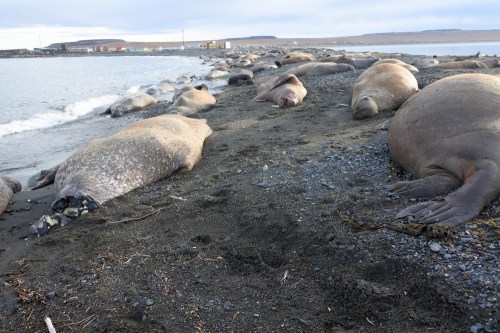 This year, the town has managed to keep the bears out of town, so while the residents are having no real problems, more than 30 bears have been spotted near town, almost certainly feeding on natural-death carcasses of walrus along the shore (see photo below from 2017 where Ryrkaypiy can be seen in the background).