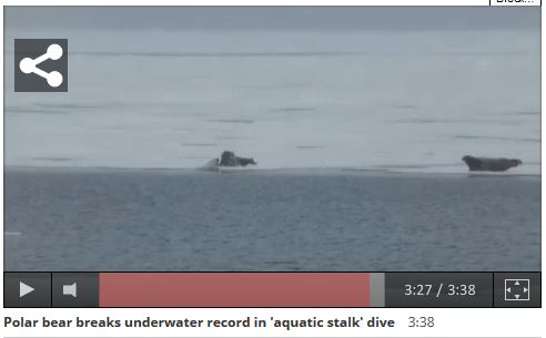 The longest-ever-recorded underwater dive by a polar bear, stalking three bearded seals, shows in striking fashion how truly difficult it is for a polar bear to catch a seal from summer sea ice. After the long dive, the bear (see below screen capture) erupts from the water to try and take the seal resting on the ice but it escapes.